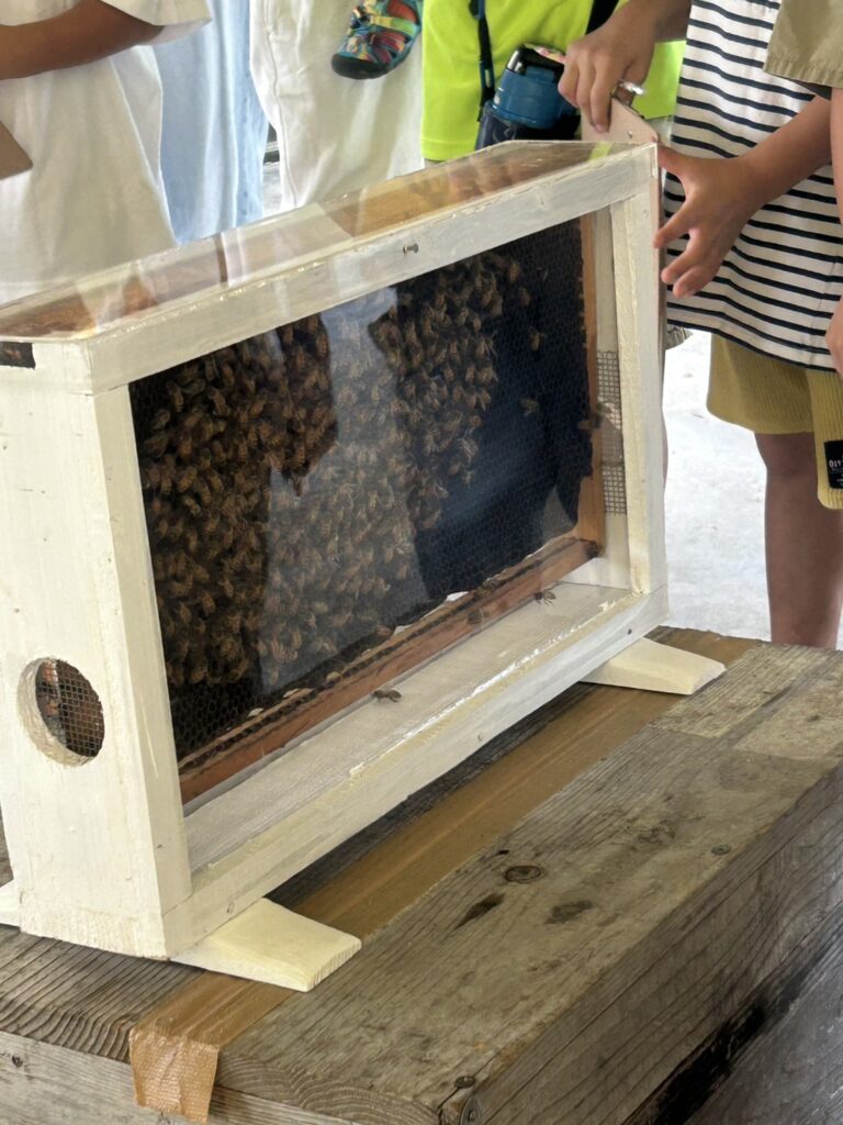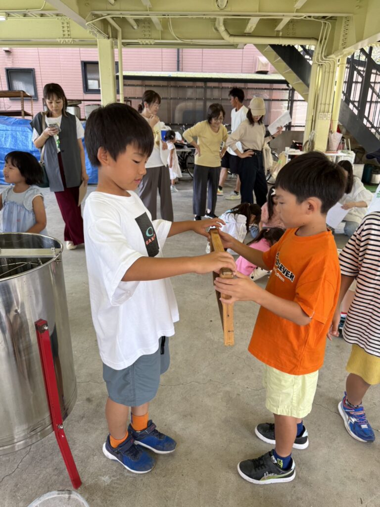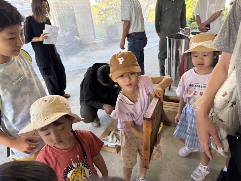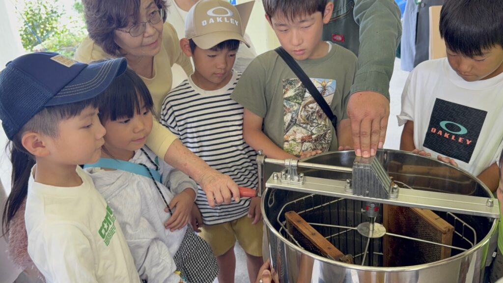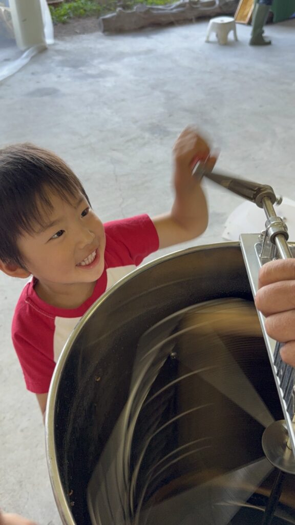 実際にミツバチを近くで見たり、手動の遠心分離機で採蜜したりするうちに